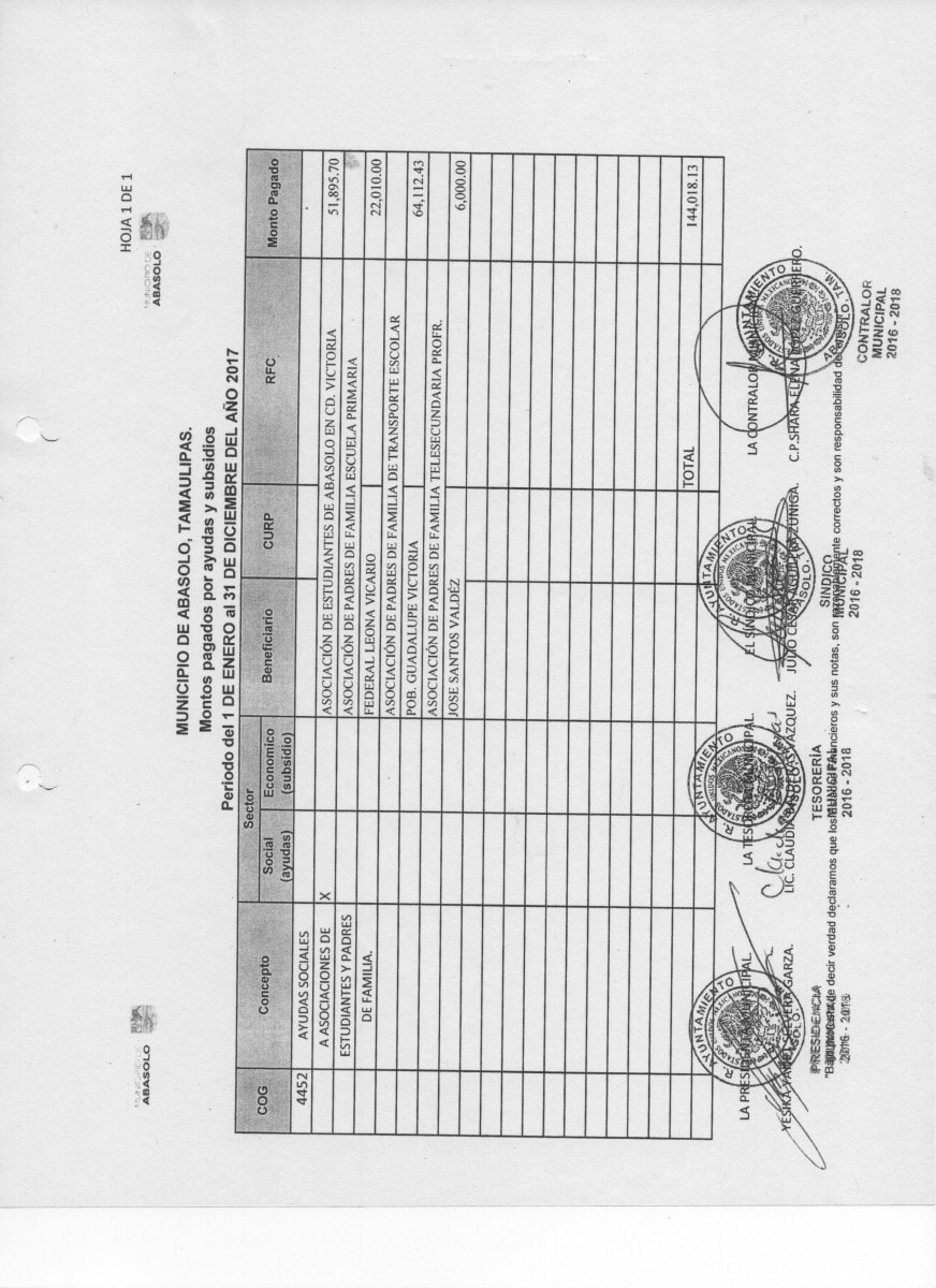 - AUTORIZACIÓN QUE EMITE EL R. AYUNTAMIENTO DE ABASOLO, TAM., PARA EFECTUAR AYUDAS SOCIALES A INSTITUCIONES SIN FINES DE LUCRO, EN EL PERIODO ENERO A DICIEMBRE DEL AÑO 2019 (PARTIDA 4452)